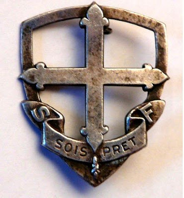 Je suis quand même plus chou et plus mignon, moi, non? Quant à l'insigne métallique, ça pourrait être un insigne civil en très gros plan mais a-priori, c'est plutôt effectivement un insigne de promesse. Un insigne de promesse dans sa présentation fédérale des années 40-50: l'insigne du mouvement (croix potencée, croix fleur-de-lysée, arc tendu, tables de la loi...) dans un écu ajouré avec la bande "toujours prêt" (le "TP" n'était pas toujours marquée) et les lettres SF, ainsi que le noeud au centre de la banderole, symbolisant le lien entre les scouts du monde. |